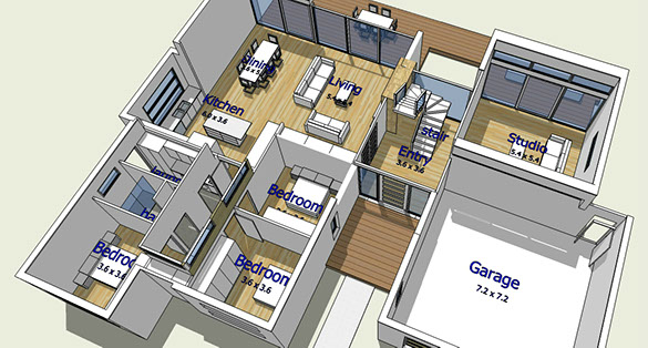 By purchasing a TreblD SketchUp model you can explore the building in detail at your leisure. The price includes Copyright Consent Registration which means that you are free to make any modifications to the model, and take the model to your architect or Drafting Service to get them to prepare your construction drawings.